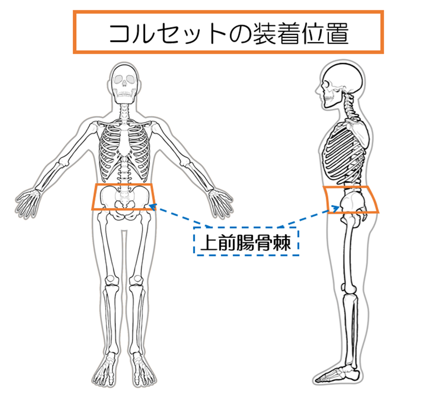 コルセットを巻くときは、お腹の真ん中ではなく、骨盤の前側に触れる骨の出っ張り(上前腸骨棘)を基準に、コルセットの幅が上に約2/3、下に約1/3あたりにくる位置に巻くのが理想と考えます。その理由としては腰痛が起こりやすい腰椎の下部から仙骨の上部にかけてを覆うような位置に巻くことで、負担のかかりやすい部分を効率よくサポートできるからです。さらに骨盤をしっかり包んで巻くことで体幹全体の“土台”が安定し、その上にある背骨(脊柱)も自然と安定しやすくなると考えます。