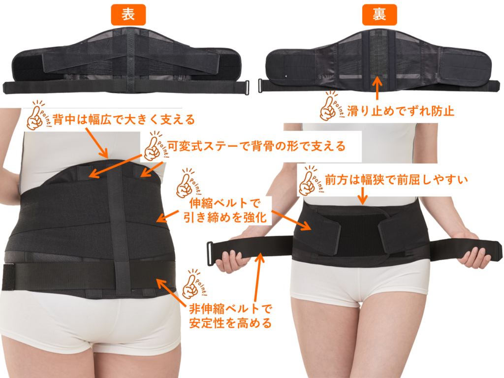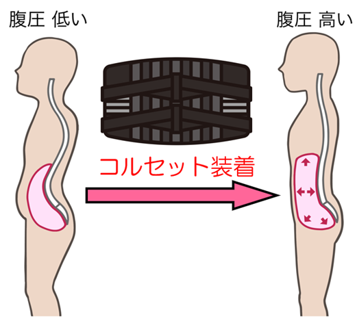 コルセットは腹圧を外側から補助し、体幹の安定性を高めることで、腰をしっかりとサポートしてくれます。